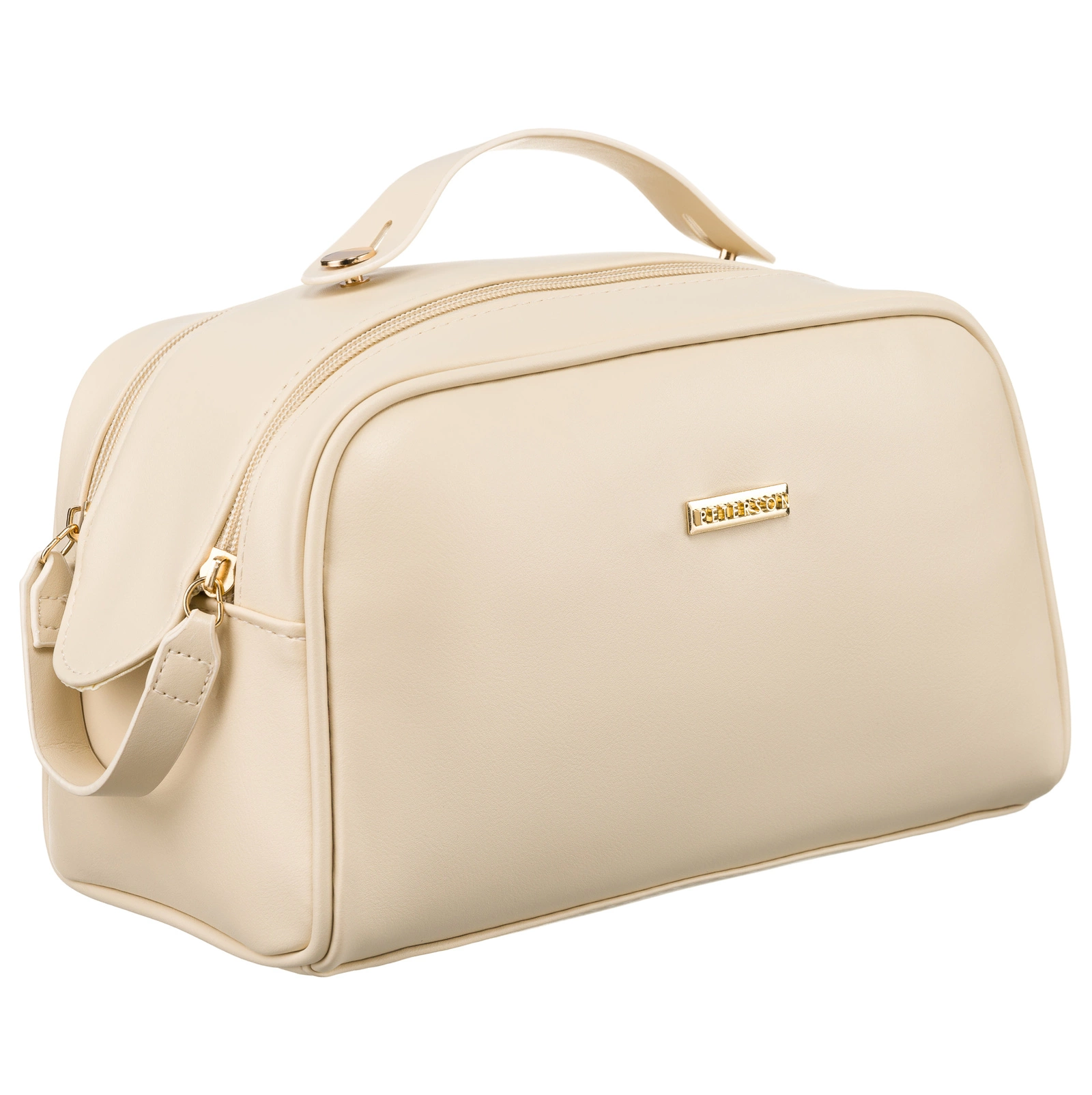 Damska kosmetyczka marki Peterson, wykonana z wysokiej jakości materiału syntetycznego. Jej klasyczny kolor, w połączeniu z delikatnym połyskiem materiału, nadaje jej luksusowego charakteru. Na froncie umieszczono subtelną, złotą plakietkę z logiem marki Peterson, która podkreśla prestiżowy wygląd kosmetyczki.
